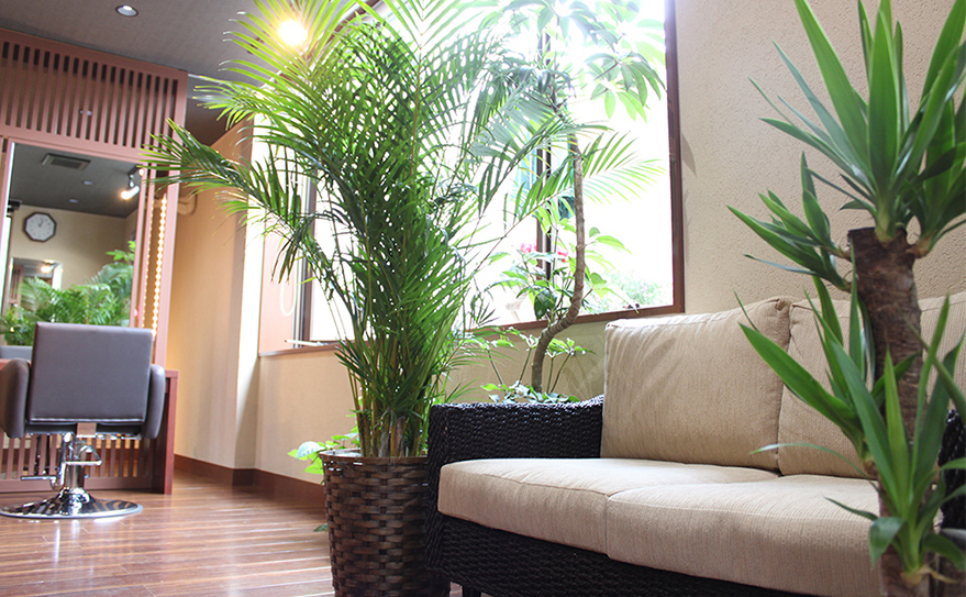 ナチュラルな店内「お客様にとっておきのひと時を過ごしてほしい」という想いから、内装にもこだわっております。当サロンは、入り口にある緑色のテントが目印。自然のぬくもりを感じられるよう、インテリアはダークウッドで統一しています。入口とベランダにはたくさんの観葉植物やお花を置き、一年中植物の息吹が感じられます。地上から差し込んでくるやわらかな光を感じながら、ゆっくりとお過ごしください。